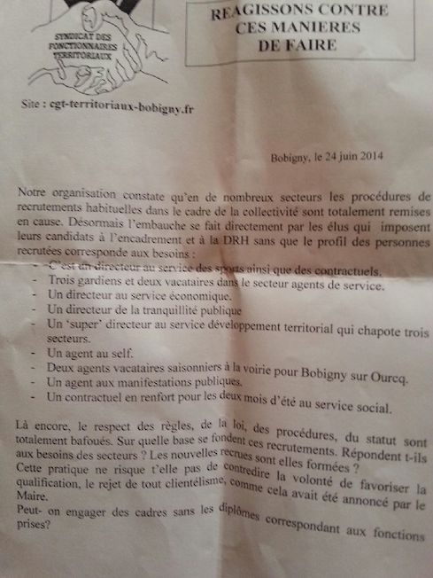 Entre temps,un nouveau tract nous est parvenu à la rédaction d'Aliance concernant toujours les embauches à la mairie de Bobigny .