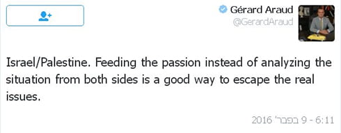 Araud a plus tard posté un autre tweet: "Israël / Palestine : Alimenter la passion au lieu d'analyser la situation des deux côtés est un bon moyen d'échapper aux vrais problèmes."