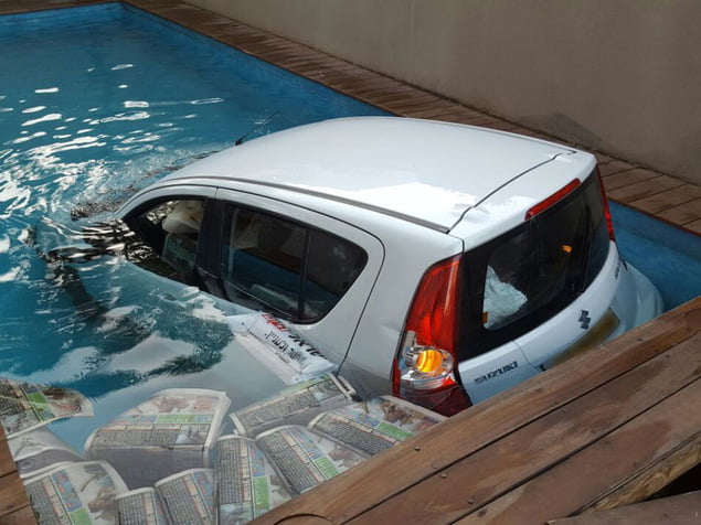 Il passe la marche arrière au lieu de la première et se retrouve dans une piscine
