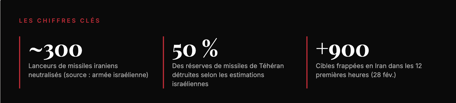 Une déclaration qui fait écho aux données publiées par l'armée israélienne, selon lesquelles environ 300 lanceurs de missiles iraniens auraient déjà été mis hors d'usage depuis le déclenchement des opérations Epic Fury et Roaring Lion, le 28 février 2026.