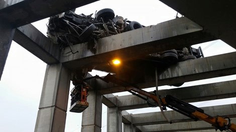 Les pompiers ont été appelés pour extraire le conducteur du camion de 48 ans, et un garçon de 14 ans qui était avec lui. L’opération de sauvetage a été complexe, une grue a été amenée sur place afin d’évacuer en toute sécurité les passagers de la cabine du camion.