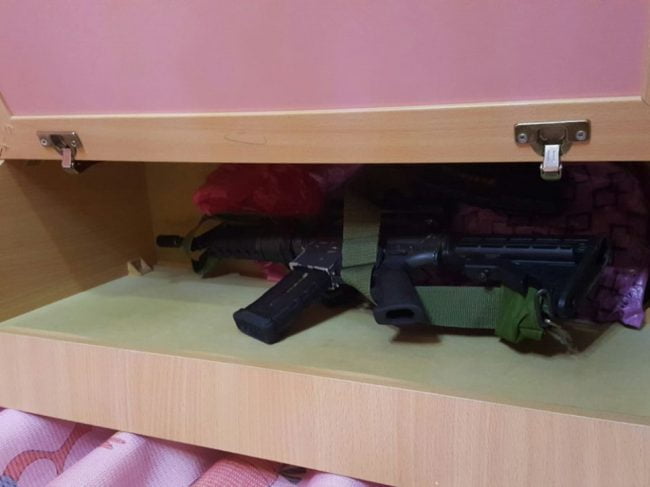 Autorisé à la publication ce matin : les forces de sécurité israéliennes ont découvert des armes mortelles, y compris un fusil d'assaut M-16, caché dans des lits d'enfants lors d'un raid effectué dans une maison, dans le cadre de la poursuite d'une cellule terroriste composée de trois hommes.