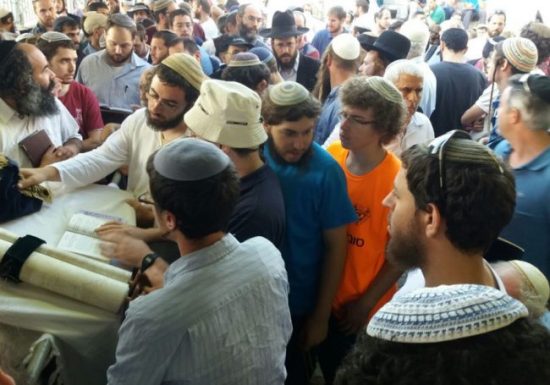 Un service de prière du matin Tisha B'Av à la porte d'entrée du Mont du Temple avant que les fidèles ne se rendent sur le site