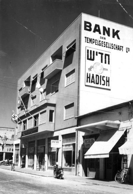 Photo de Carl Lutz.  Cet immeuble au balcon pavoisé du drapeau nazi, est situé dans un quartier  limitrophe de la vieille ville de Jaffa . Sur le coté du bâtiment on peut lire l'enseigne en allemand : " Bank der Tempelgesellschaft " Limited