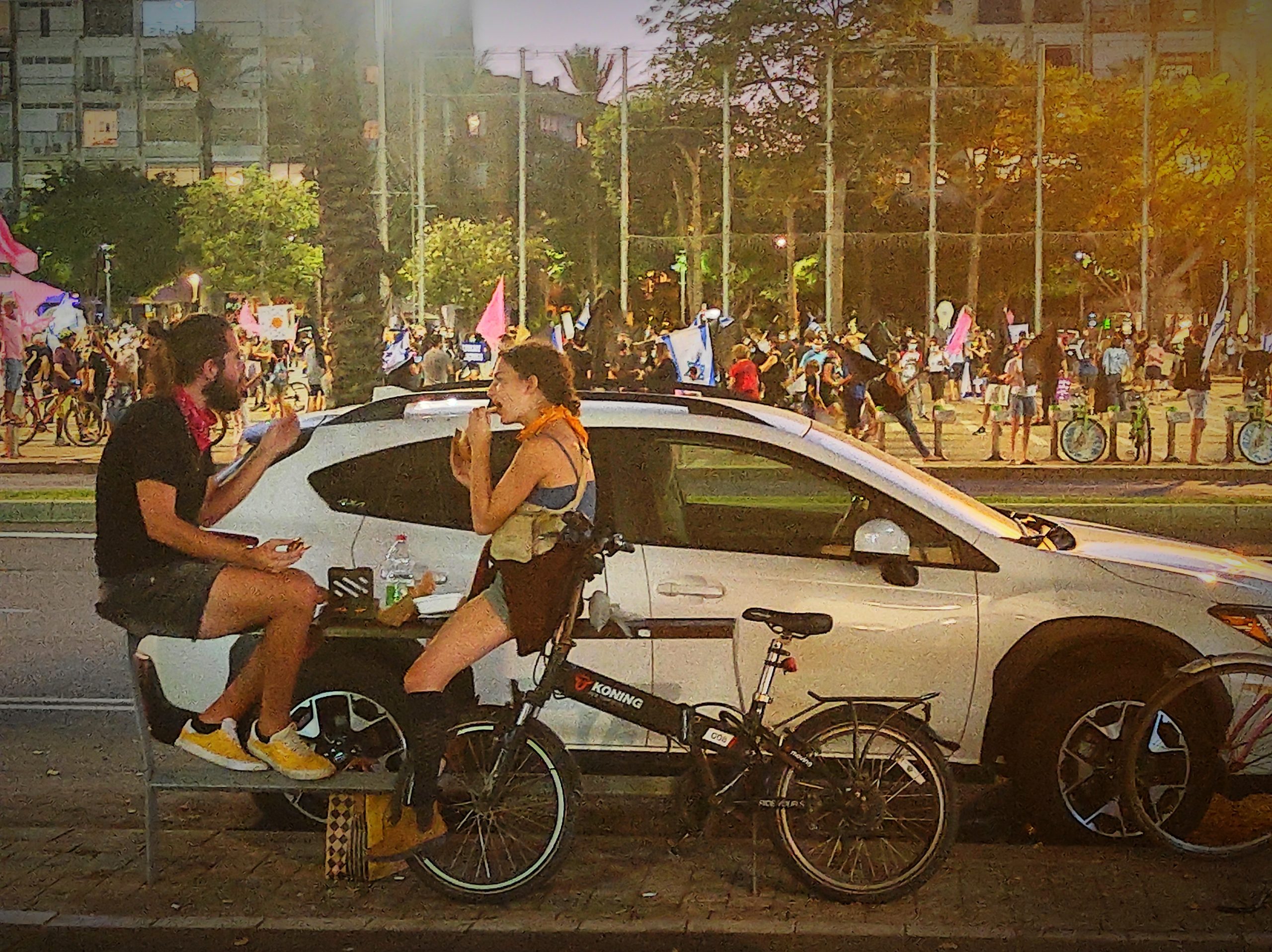 Le "freestyle" à l'israélienne, dinette sur la rambarde en pleine manifestation