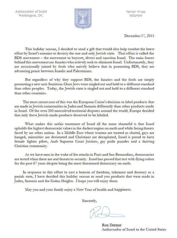 L'ambassadeur d'Israël aux Etats-Unis, Ron Dermer, a envoyé en cadeaux de fêtes de Noël des produits fabriqués dans les implantations en réaction contre ceux qui préconisent un boycott d'Israël.
