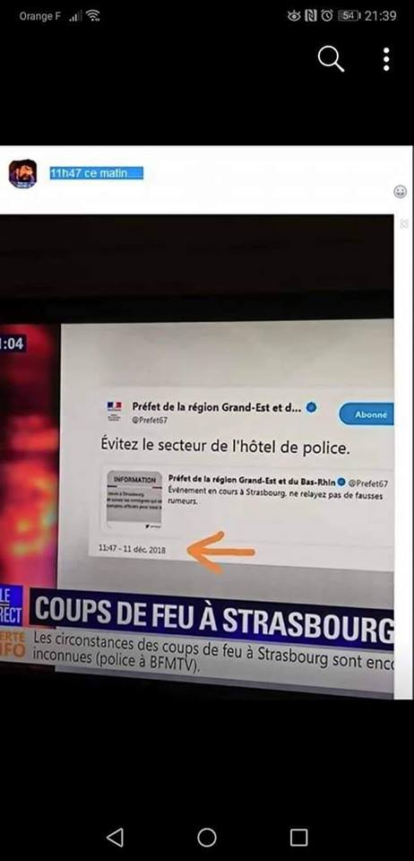 Avant même que le nom du suspect ni ses intentions ne soit dévoilés, certains accusaient déjà le gouvernement de faire diversion. C'est le cas notamment d'une internaute qui relaie une photo montrant le tweet de la préfecture du Bas-Rhin, dont l'heure de publication affichait 11h47. Or, il suffit d'aller sur le compte de la préfecture pour constater que ce fameux tweet indiquant aux riverains d'éviter le secteur de l'Hôtel de Police a été publié à 20h47 heure française.