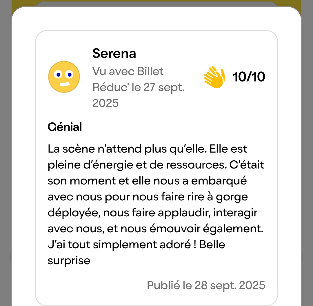 Ici, pas de quatrième mur.Mel vous parle, vous prend à témoin, vous embarque dans son tourbillon. Rires, applaudissements, interactions… Elle électrise la salle avec son énergie débordante. « C’était son moment et elle nous a embarqués avec elle », écrit Serena. Et Mel ne lâche rien. Jusqu’à la dernière seconde, elle donne tout. Même ce qu’elle ne devrait pas.