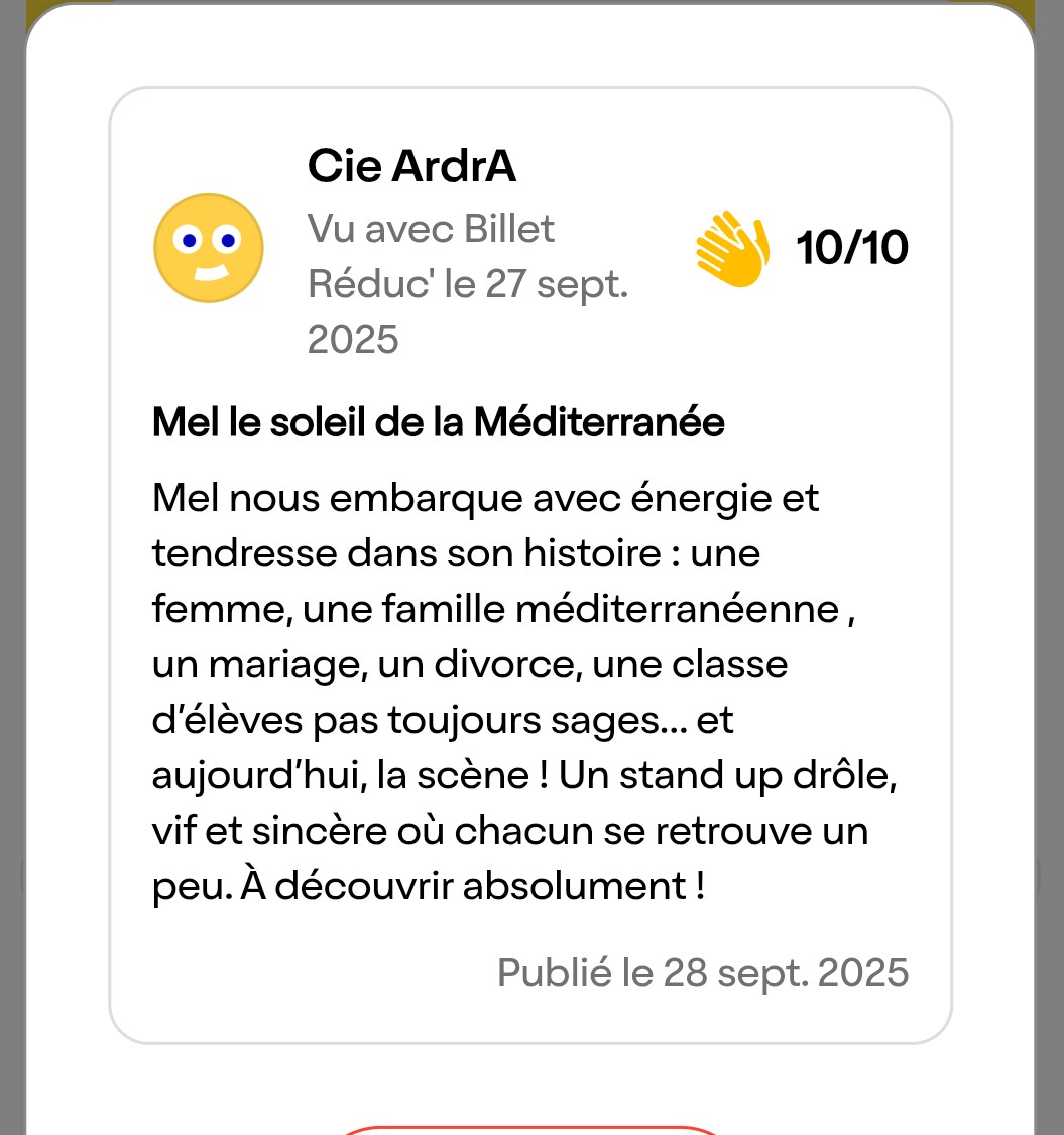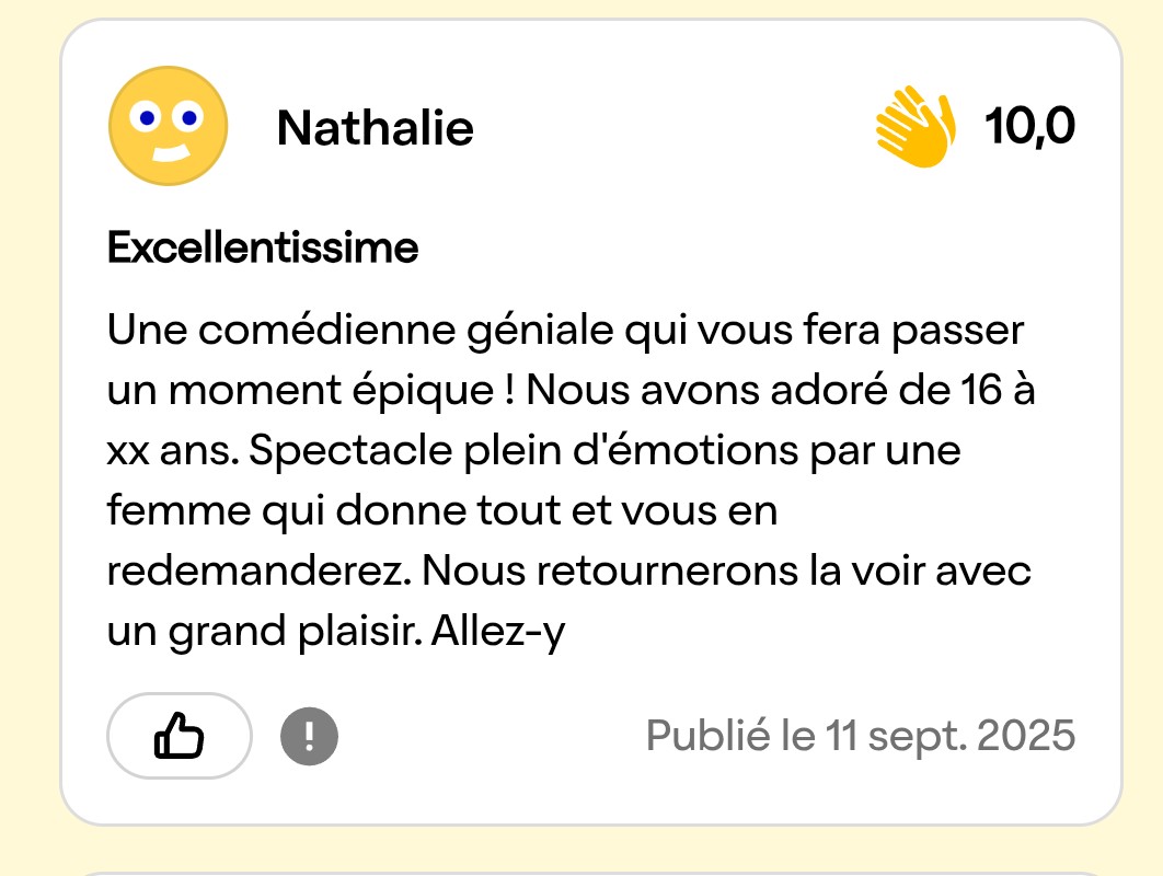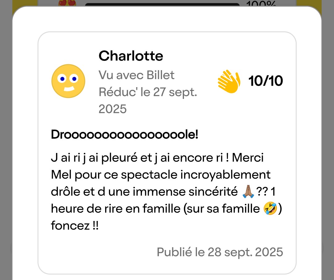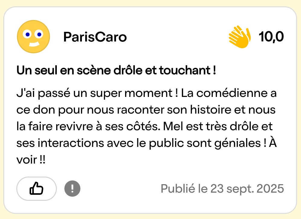 Mel est le remède parfait à une époque crispée. Elle ne fait pas que rire : elle libère. Elle ne fait pas que parler : elle raconte ce qu’on n’ose pas dire. Et tout cela, en une heure qui passe trop vite.