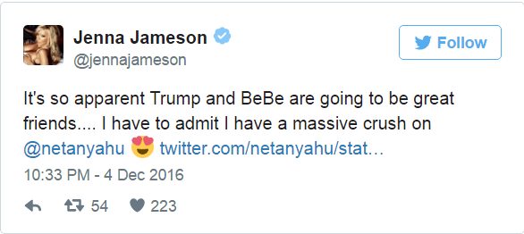 Hier (dimanche, heure de Los Angeles), Jameson a tweeté : « Je dois avouer que je craque sérieusement pour Netanyahu ». Elle a également chanté les louanges de Donald Trump et de BeBe (sic), affirmant qu'ils représentaient la combinaison parfaite, terminant son message par un « Yalla Beitar » (pour l’équipe de football israélienne N.D.T) que l’on sent un peu moins proche du sujet mais que nous acceptons tout de même.