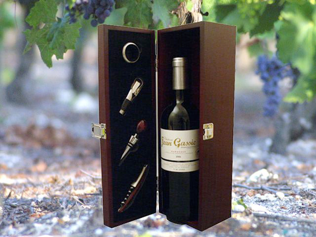 Coffret sommelier façon cuir avec 4 accessoires + une bouteille Montagne Saint Emilion